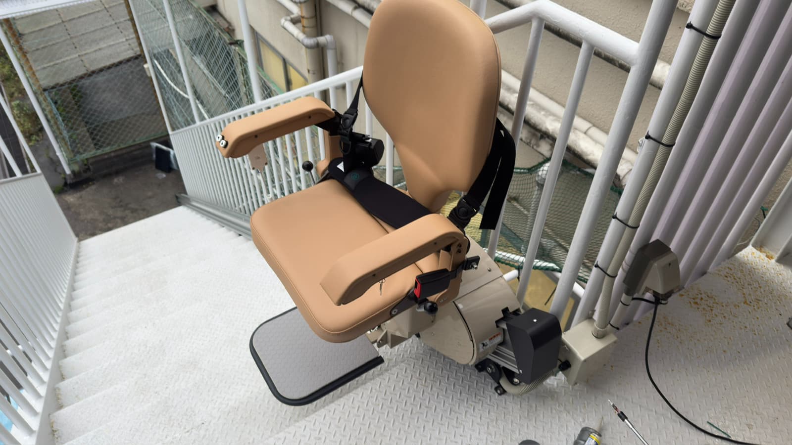 病院という場所柄、工事中もすぐ横を患者様や看護師の方が頻繁に通行されるため、声掛けなど、安全確保には細心の注意を払って施工いたしました。 設置後は、階段で滑った経験をお持ちの患者様や、介助にあたるスタッフの方々が不安を感じないよう、乗り降りの際の転倒防止を含め、一つひとつの動作を丁寧にご説明させていただきました。患者様、病院の関係者の方それぞれに喜んでいただけてとても嬉しく感じました。